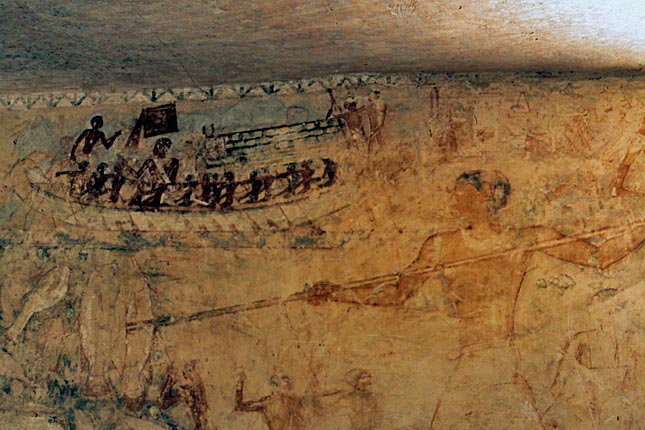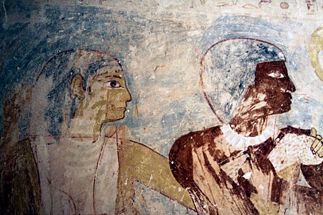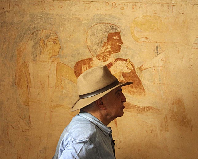 Rudj-Ka wird in dem Grab neben seiner Ehefrau dargestellt. Die Nase des Beamten weist eine ungewöhnliche Form auf und ähnelt der von Zahi Hawass. Das bemerkte der Chef der Altertümerverwaltung wohl auch selbst - jedenfalls ließ er sich hier direkt neben dem Gemälde des Hofbeamten im Profil fotografieren. |