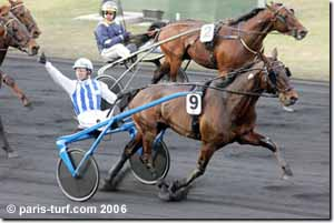 Christophe Gallier mit Jag de Bellouet in 1,11,6 über 2100 m. man beachte die Gleichheit der Haltung des Fahrers zum Prix d´Amerique!!! |
